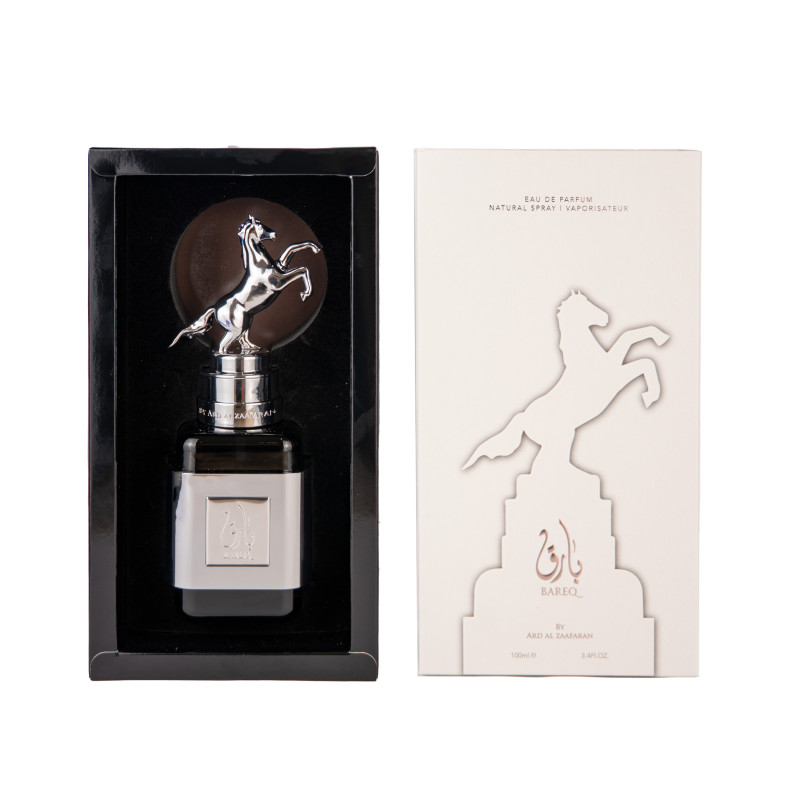 Bareq EDP 100 ml da Ard Al Zaafaran é uma fragrância masculina que combina frescor cítrico e especiado com uma base quente e amadeirada. Sua abertura traz bergamota, maçã e pimenta-rosa. No coração surgem jasmim, rosa e notas de especiarias. Ao fundo predominam âmbar, almíscar, sândalo e baunilha.