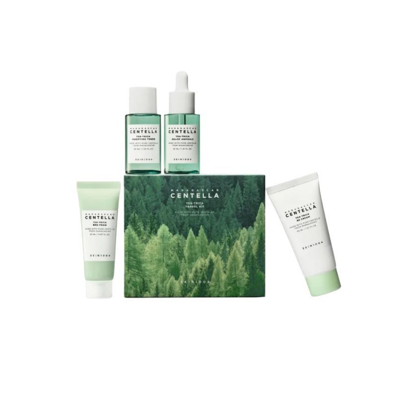 Kit de viagem com rotina completa para pele oleosa, mista ou com tendência acneica. Inclui 4 produtos da linha Tea-Trica da SKIN1004, formulados com centella asiática de Madagascar, tea tree e BHA, que ajudam a limpar profundamente os poros, controlar a oleosidade e acalmar a pele irritada sem ressecar.