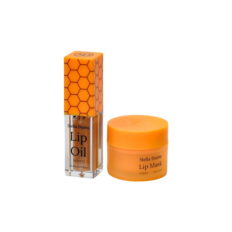 Kit de cuidado labial com óleo e máscara labial em formato duo Honey da Stella Dustin. Hidrata profundamente, nutre e ajuda a regenerar os lábios, deixando-os macios, brilhantes e com acabamento saudável e natural.