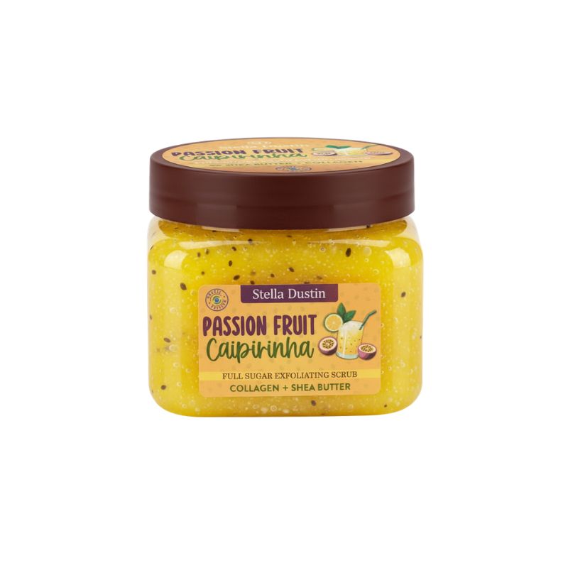 Esfoliante corporal com fragrância Passion Fruit Caipirinha da Stella Dustin. Ajuda a remover células mortas, deixando a pele macia, renovada e hidratada, com um aroma frutado tropical inspirado no coquetel caipirinha que proporciona frescor e energia.